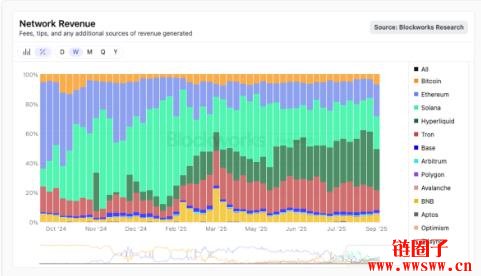 Hyperliquid 是一个Layer-1 区块链,作为旗下热门永续合约交易所的基础架构。自2023 年推出以来,该区块链快速成长,Blockworks 的研究数据显示,Hyperliquid 的网路收入已连续四周在所有区块链中蝉联第一。
