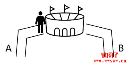 然后再请客人从A、B 中选一条路,小拓再由那条路下山 ( 如例图C )。
