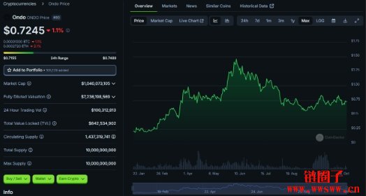 作为一般用户,如评估其代币具有投资效益,我们可以购买并交易相关项目代币,好比Ondo Finance,我们知道其USDY 是第二大美债代币化商品,而原生代币$Ondo 可以在协议中参与治理,$Ondo 于发行后最高涨幅超过700%,目前也是热门的RWA 项目代币。